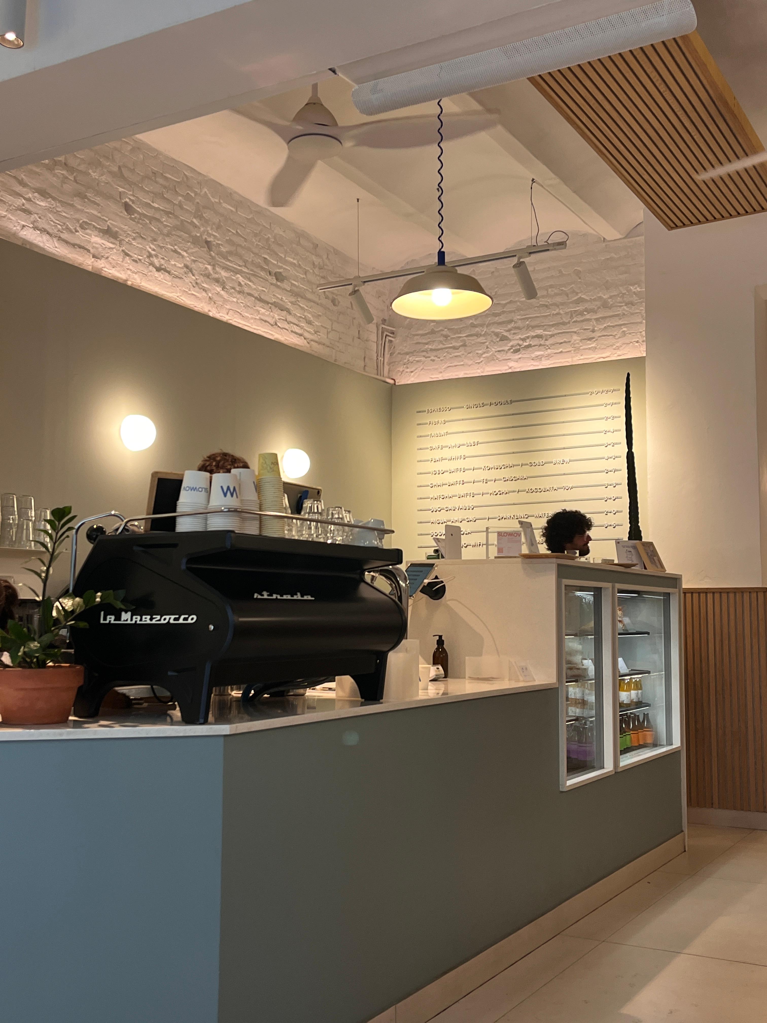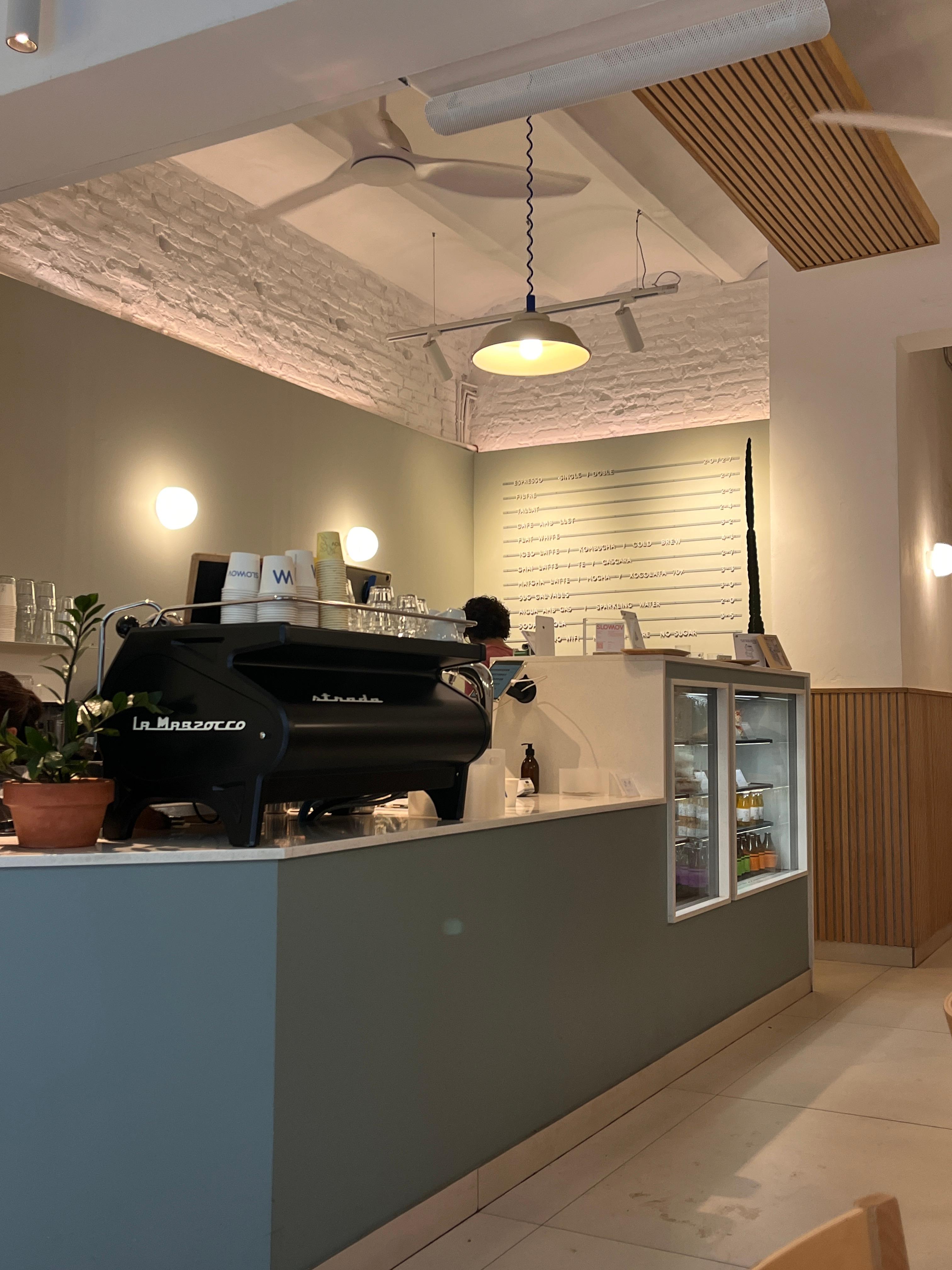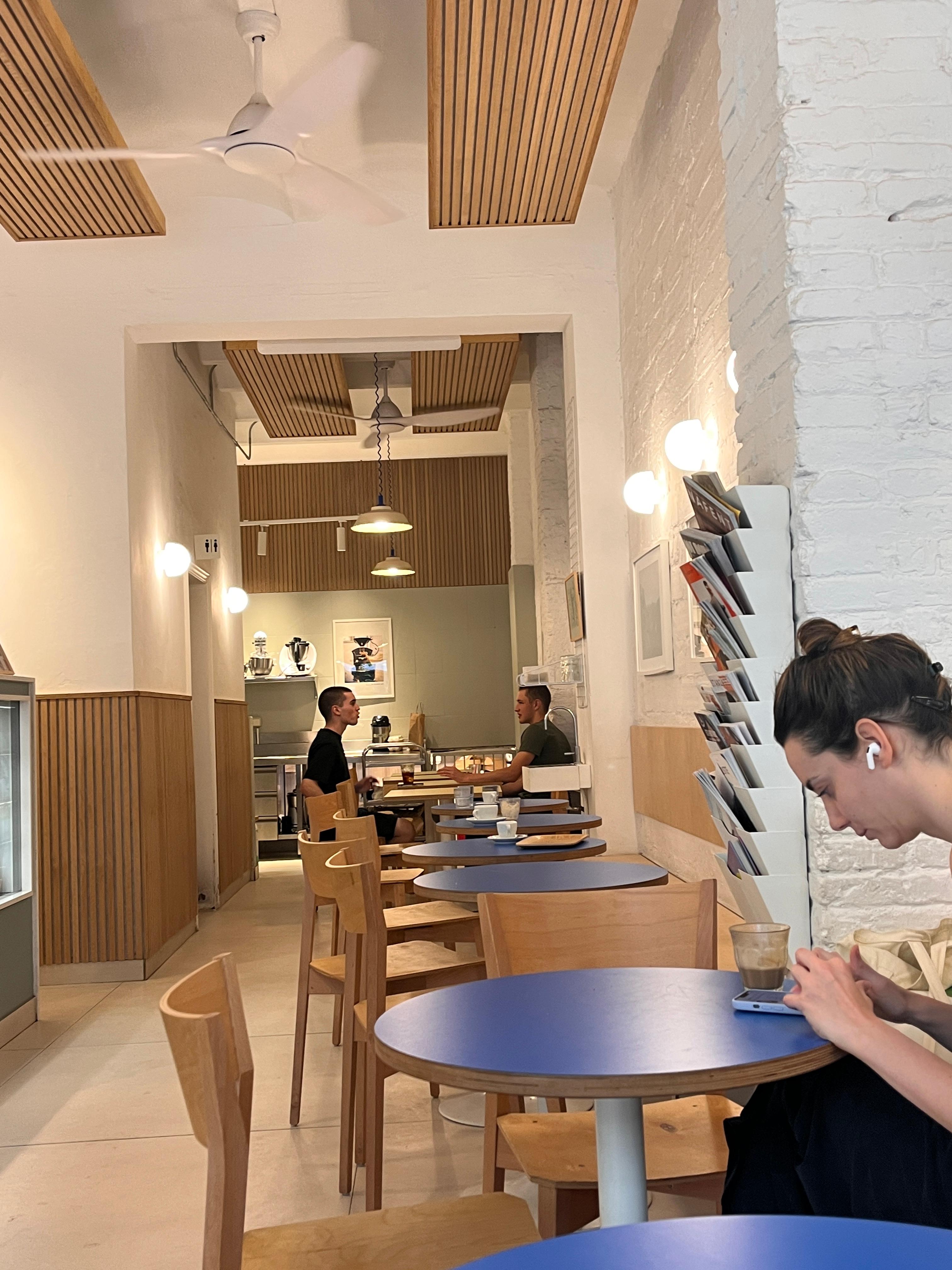 아무튼 그래서 이 커피숍은 그라시아지구 라고 하는 주거지 역쪽에 위치에 있는데요. 그라시아지구에는 조그마한 귀여운 상담들이 많이 있어서 이곳저곳 둘러보시기 편하실 겁니다. 그리고 이 커피숍도 이 상점들 근처에 있기 때문에 바르셀로나 시내에 중심에서 가우디 작품도를 구경하시고 위쪽으로 살짝 올라가셔서 이 꽃 주변들을 그냥 걸어 보시는 것도 괜찮을 것 같아요. 딱히 뭐 사고 싶은 게 없어도 아니면 할 일이 없을 때 그럴 때 걸어 다니면서 목이 딱 중 그런 공간인 것 같습니다. 그리고 보통 새 페이는 점심시간이 2시 정도가 되는데요. 이때쯤에 이 카페를 가시면 사람들이 또 은근히 많이 있을 수가 있기 때문에 그 부분 유의 하시고제가 봤을 때는 카페 크기 기준 그 테이블 수는 적당히 있는 것 같습니다만 뭐 점심시간 타이밍을 잘 못 맞춰 간다면 의자에 앉을 수 없는 경우도 있을 거 같아요. 물론 점심시간이기 때문에 사람들이 금방 빠지기는 할 테지만 좀 오래 앉아 계실 거라면은 점심시간은 살짝 피해서 가는 것도 좋을 것 같아요.